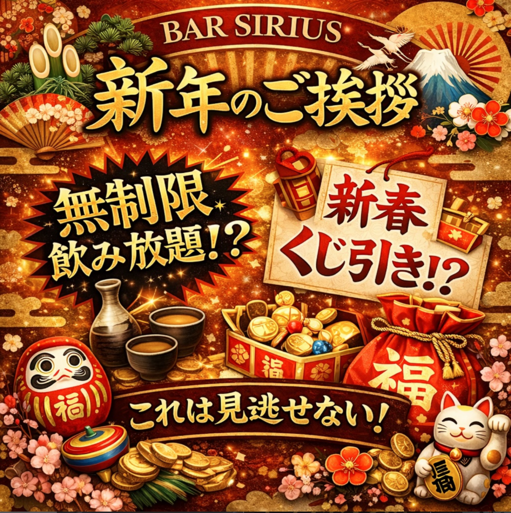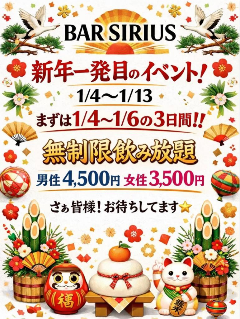 新春イベント第2弾のお知らせ📢:期間 1月15日~1月31日・SIRIUS福袋 ¥4,000(1万円相当)合計2時間分飲み放題、ショット6杯 ¥7,500(2万円相当)合計4時間分飲み放題、ショット12杯・シャンパン福袋¥15000でそれ以上のボトルが当たる⁉️対象シャンパン・... -